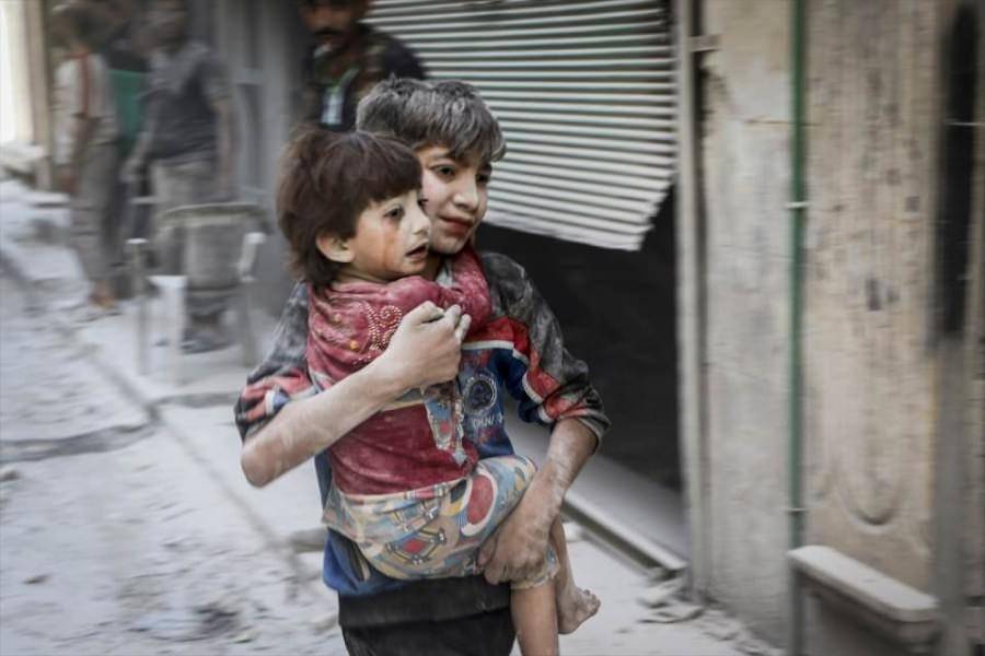 Rus ordusuna ait savaş uçağı, Halep'te muhaliflerin denetimindeki Salihiyin semtinde yerleşim yerini bombaladı. Saldırıdan etkilenen bir çocuk, kucağında taşıdığı kardeşiyle birlikte bölgeden uzaklaştı.