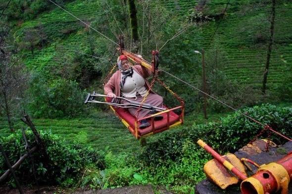 Rize’de kuma olan iki yaşlı kadın evlerine ulaşmak için ilkel teleferikle 70 metre derinlikteki vadiyi geçmek zorunda. Fotoğraf: Göktürk Fırat