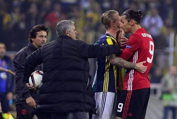Fenerbahçe-Manchester United maçında Zlatan Ibrahimovic, Simon Kjaer`in boğazını sıktığı o an. Fotoğraf: Mehmet Şirin Topaloğlu