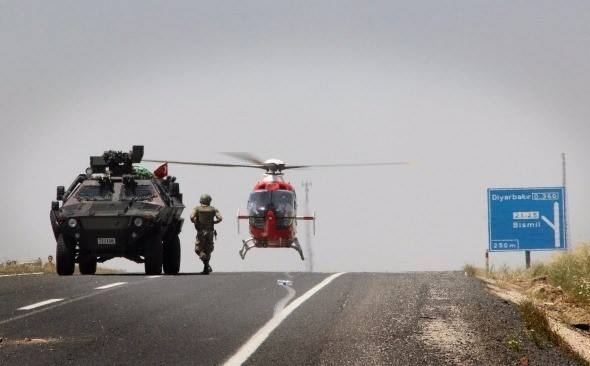 Diyarbakır’da askeri aracın geçişi sırasında yapılan saldırıda 7 asker yaralandı. Yaralı askerler yola inen helikopter ile Diyarbakır Askeri Hastanesi’ne kaldırılarak, tedavi altına alındı. Fotoğraf: Burak Emek