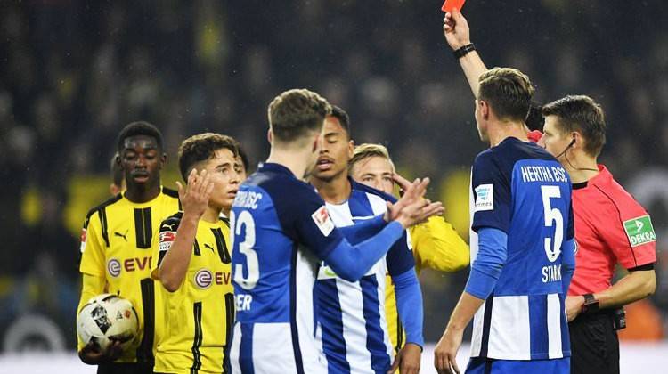 Alman Futbol Federasyonu'ndan yapılan açıklamaya göre Hertha Berlin maçında tartışmalı bir kırmızı kart gören Dortmund'un yıldızı Emre Mor iki maç ceza aldı.